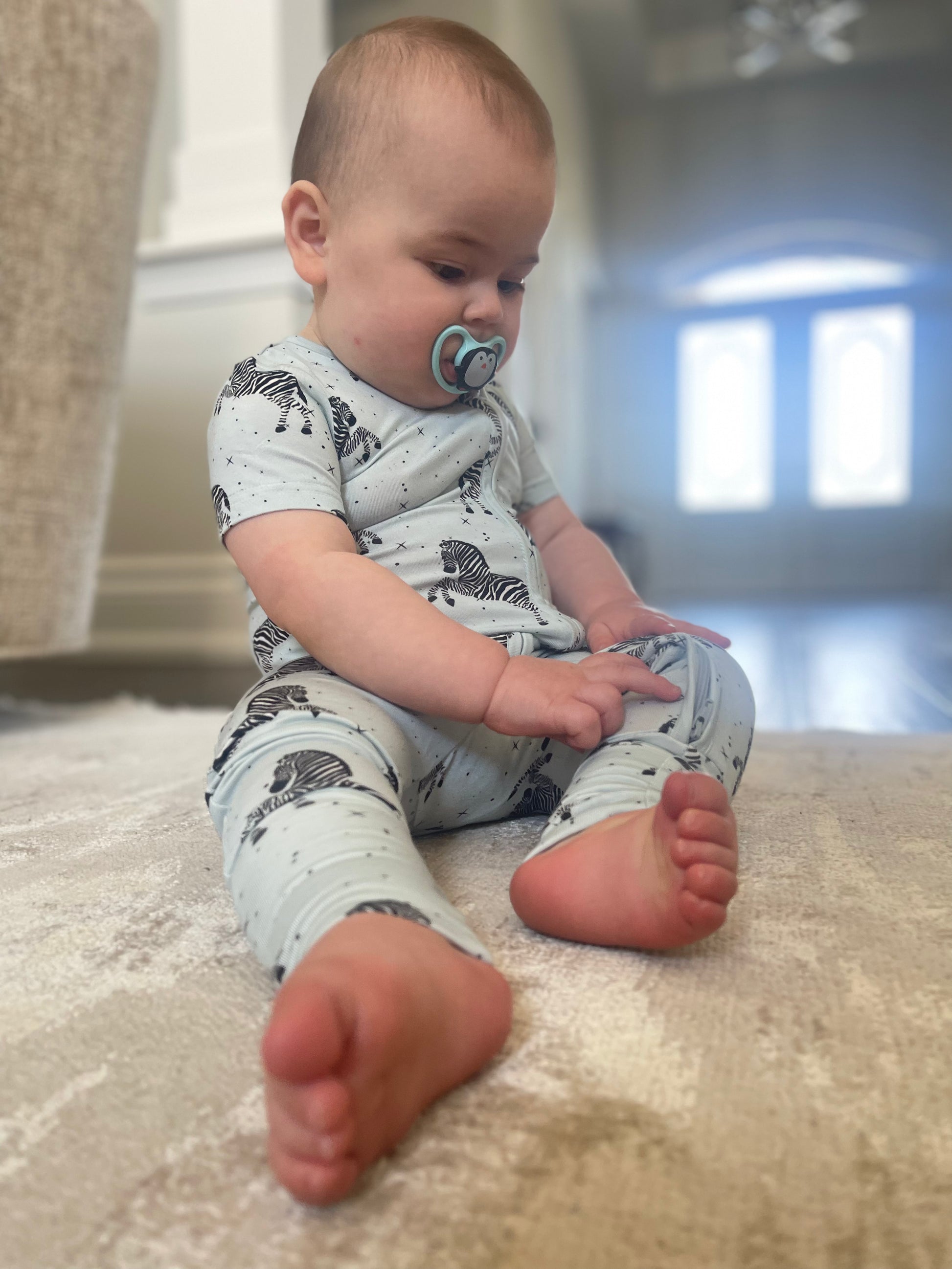 Our Short Sleeve Zip-Up features a two-way zipper for easy diaper changes.